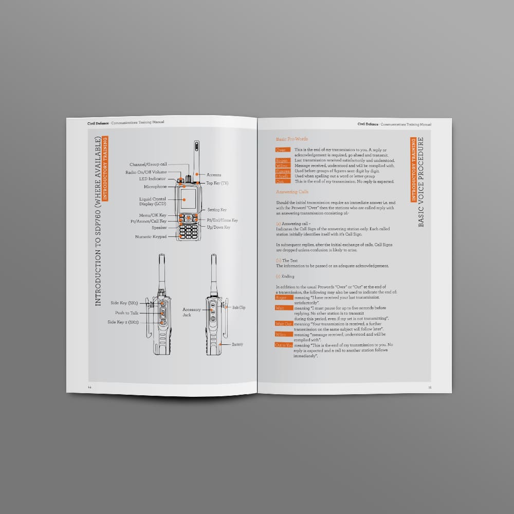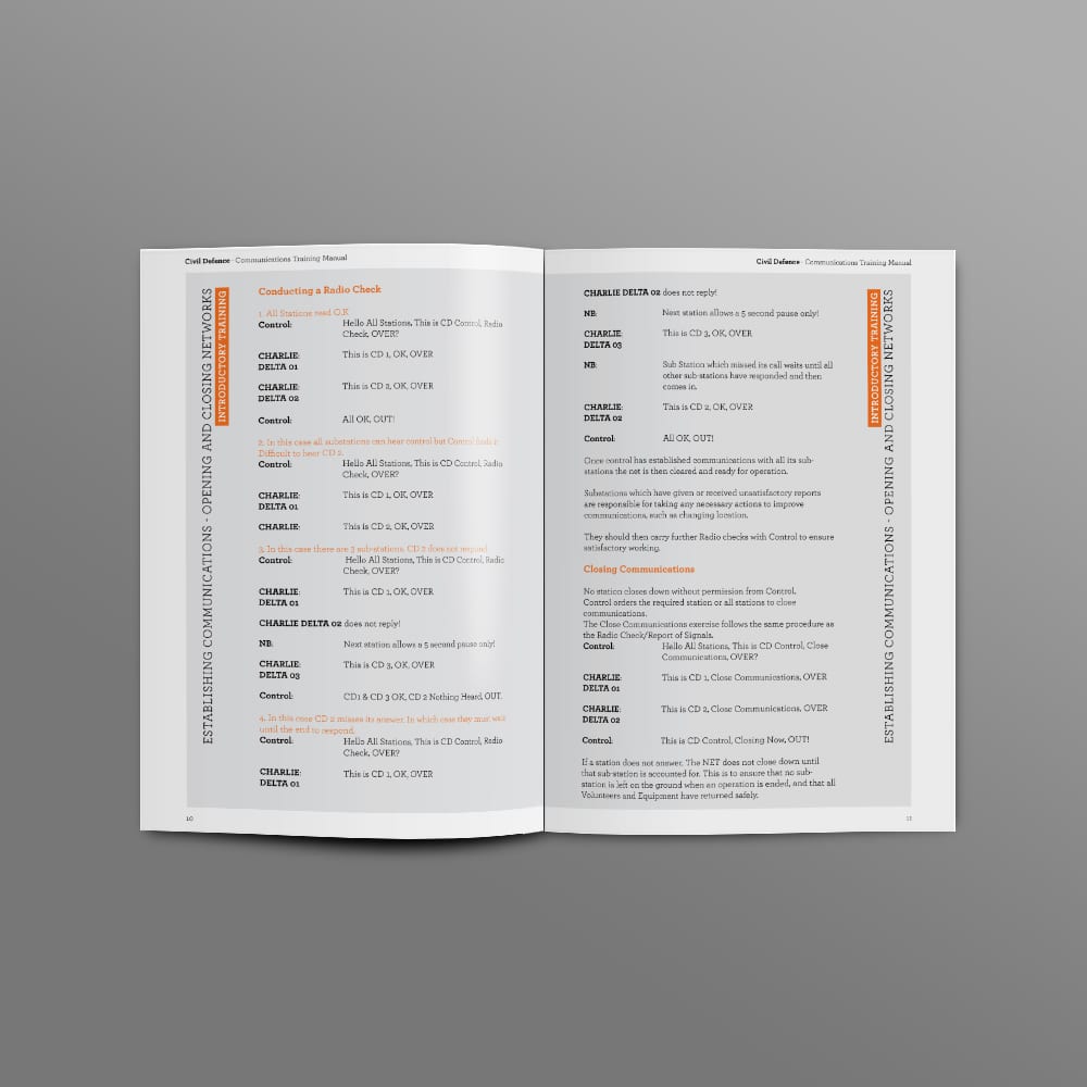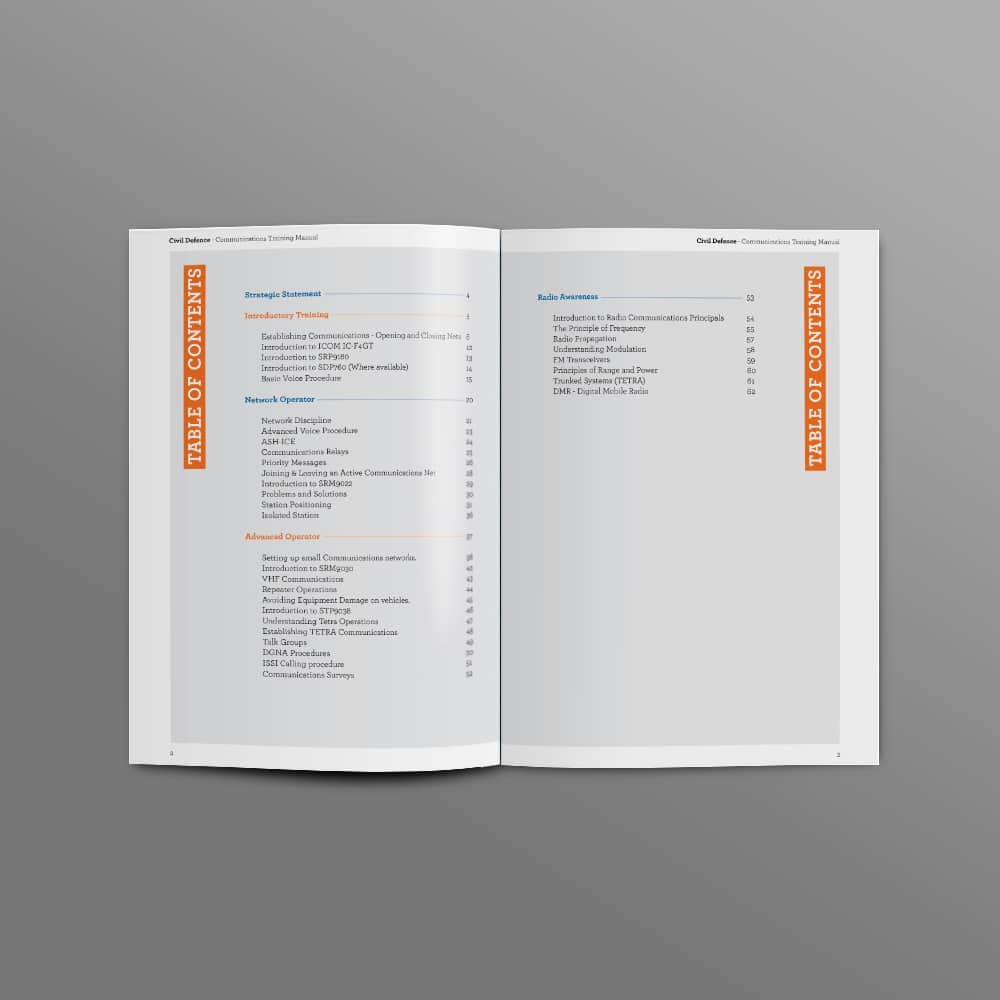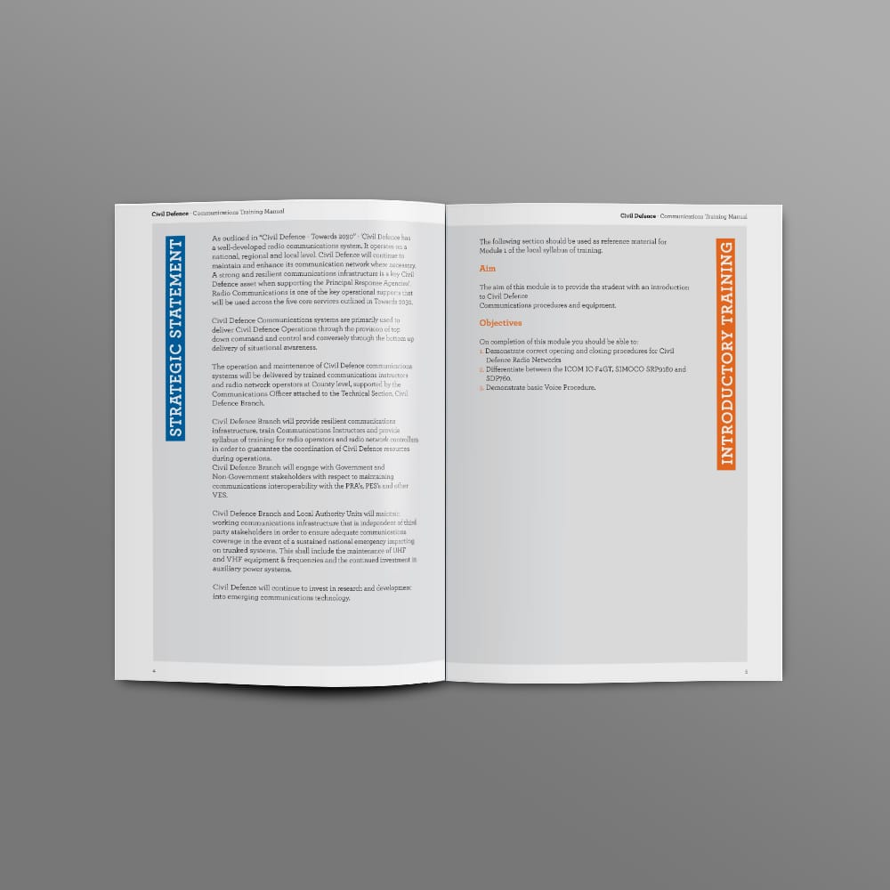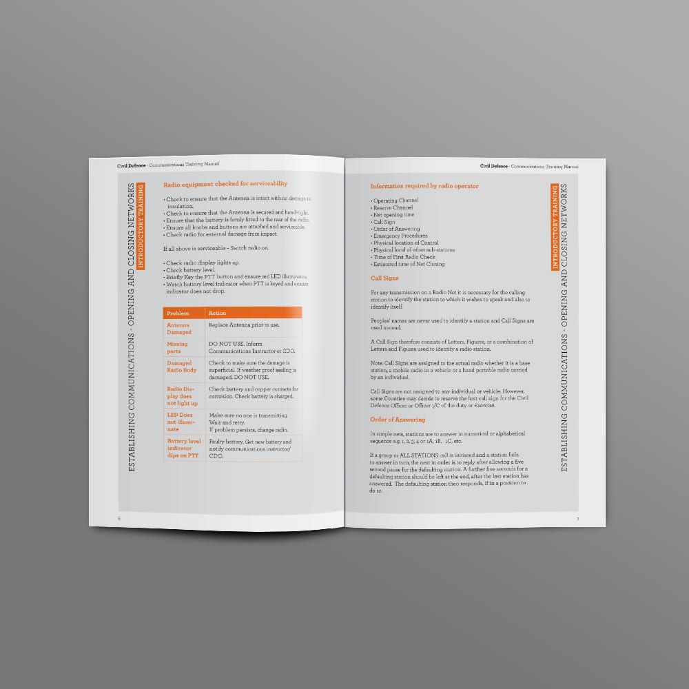 Here is a brochure design we have just completed for the Civil Defence in Ireland. It is a communications training manual. The colours used incorporate the branding of the Civil Defence. The information is designed out clearly with an emphasis on legibility and an excellent layout of a lot of information. The brochure design for this Irish based company was created by our expert graphic designers at Designwest in Mayo.