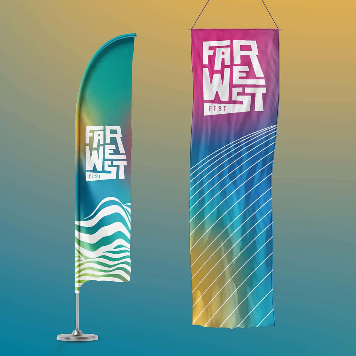 Flag Design Ireland: One of the standout creations by our graphic design team was the flag designs for Far West Festival. These visually striking flags, adorned with captivating illustrations and vibrant colors, added a touch of whimsy to the festival grounds. Each flag was meticulously designed to evoke a sense of celebration, while also reflecting the unique charm of Ireland. The resulting flag designs were an absolute hit, elevating the festival experience for attendees.