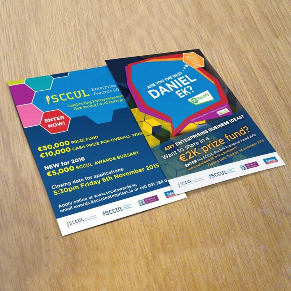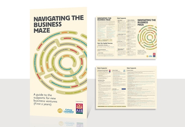 This flyer design for Galway Chamber is concerned with helping new businesses navigate their way through the maze of available resources and supports. This guide was developed to simplify the process and consolidate information on the many types of financial aid and grant support available to the business community. This flyer design is: