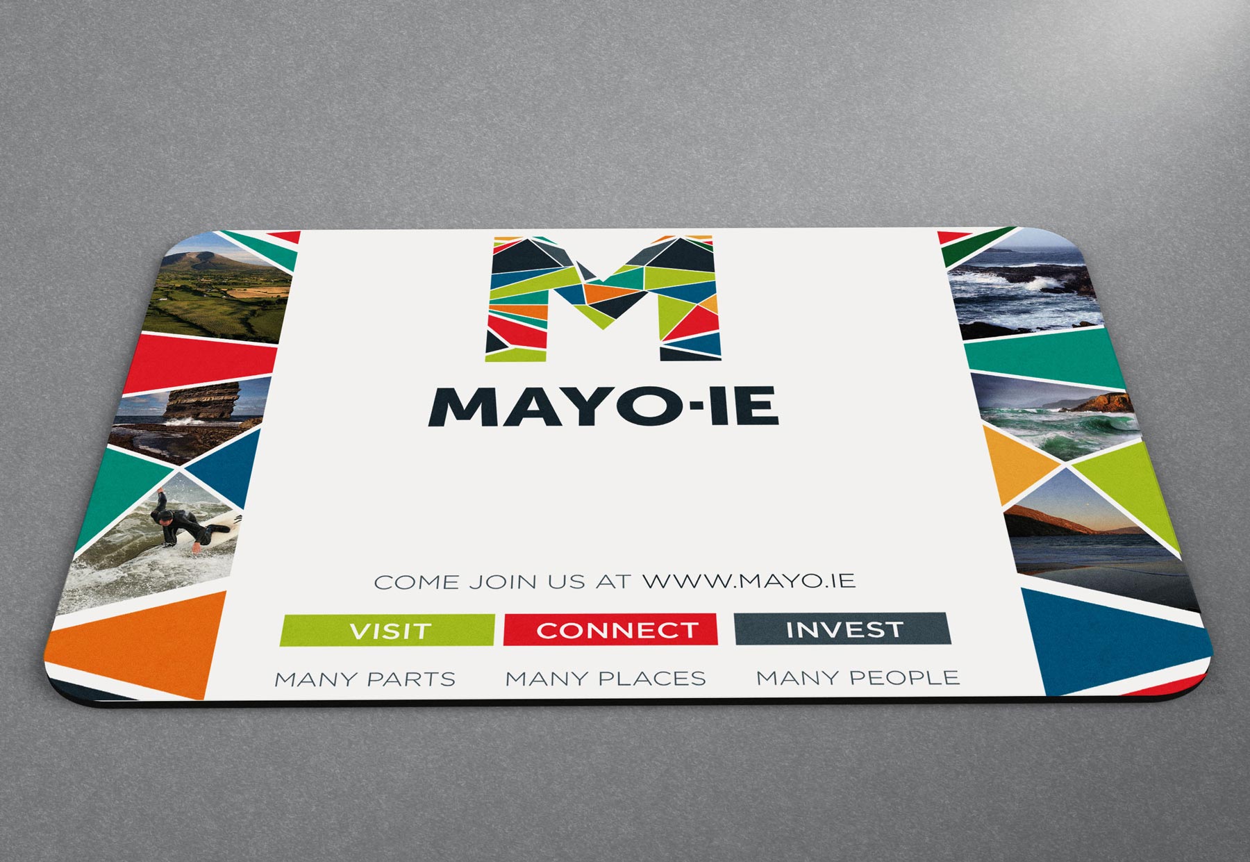 The Mayo.ie Brand Identity was created to reflect the true attributes that make County Mayo what it is today.Mayo is very unique in terms of its people and landscape. it is rich in culture & history strong and has a very healthy, vibrant and eclectic mix of business types which all call Mayo home. The Identity which is effectively a wordmark is crafted to represent the idea that Mayo is a very strong & powerful county which is made up of many people, many places and many parts. The identity itself of course represents the shape of an ‘M’ which itself is formed from many pieces of varying shapes and sizes each of which theoretically represent the people, places and parts which all come together to make Mayo what it is.