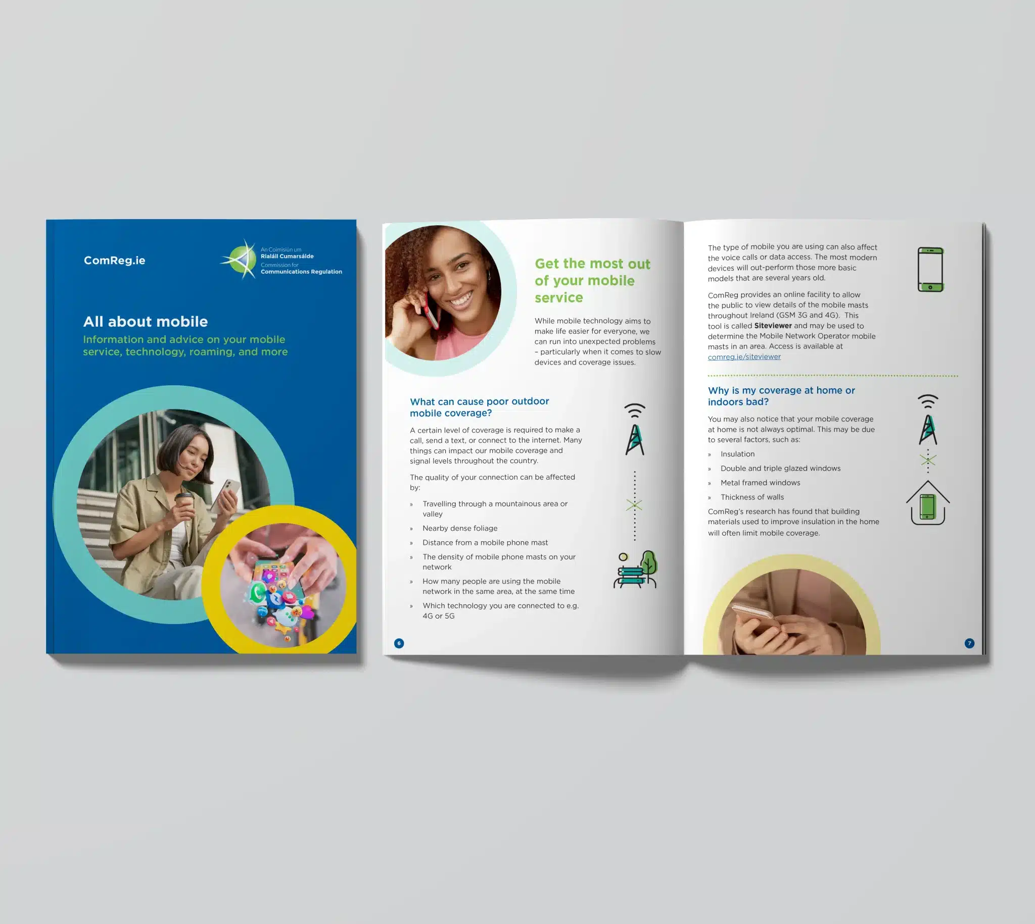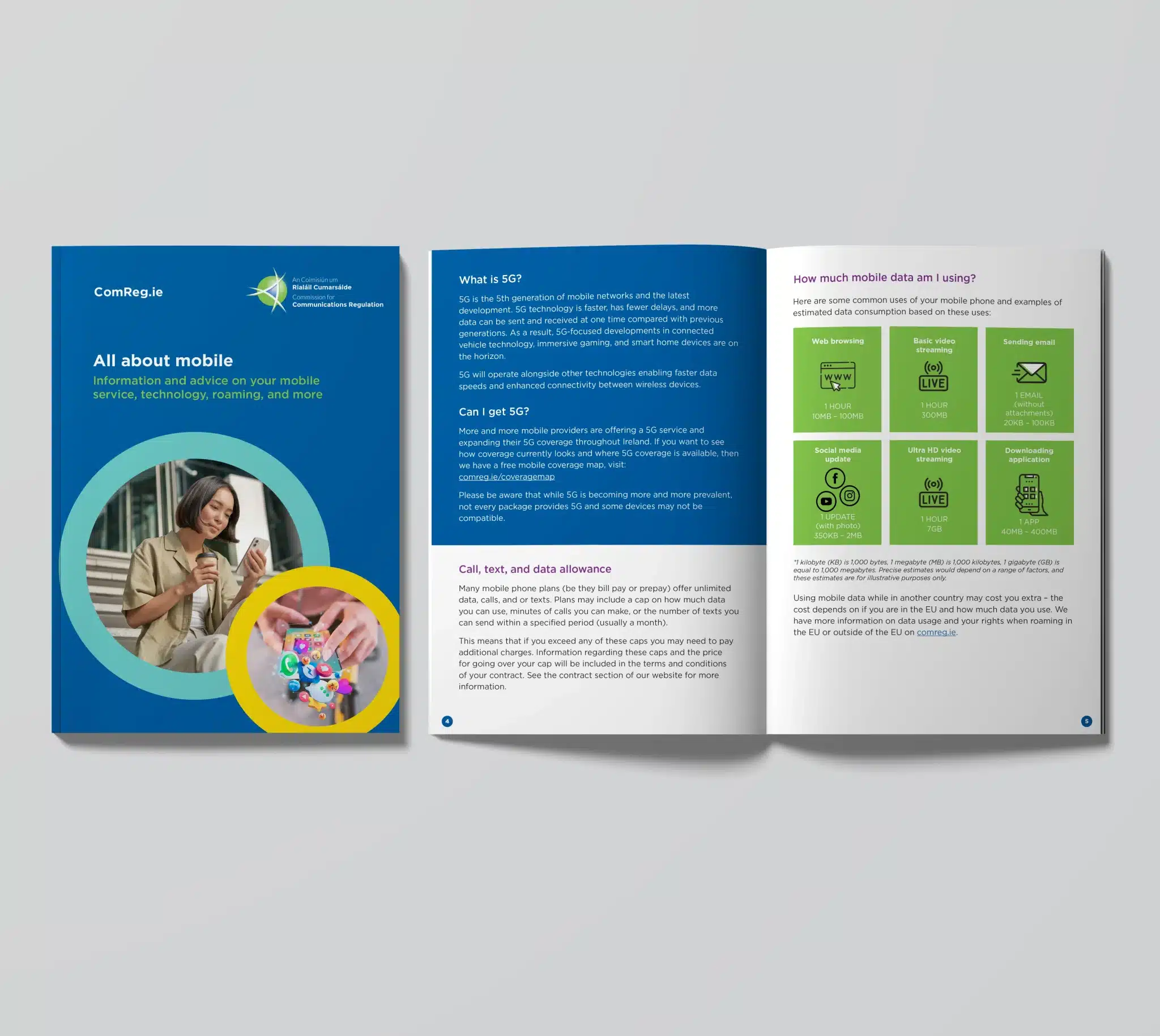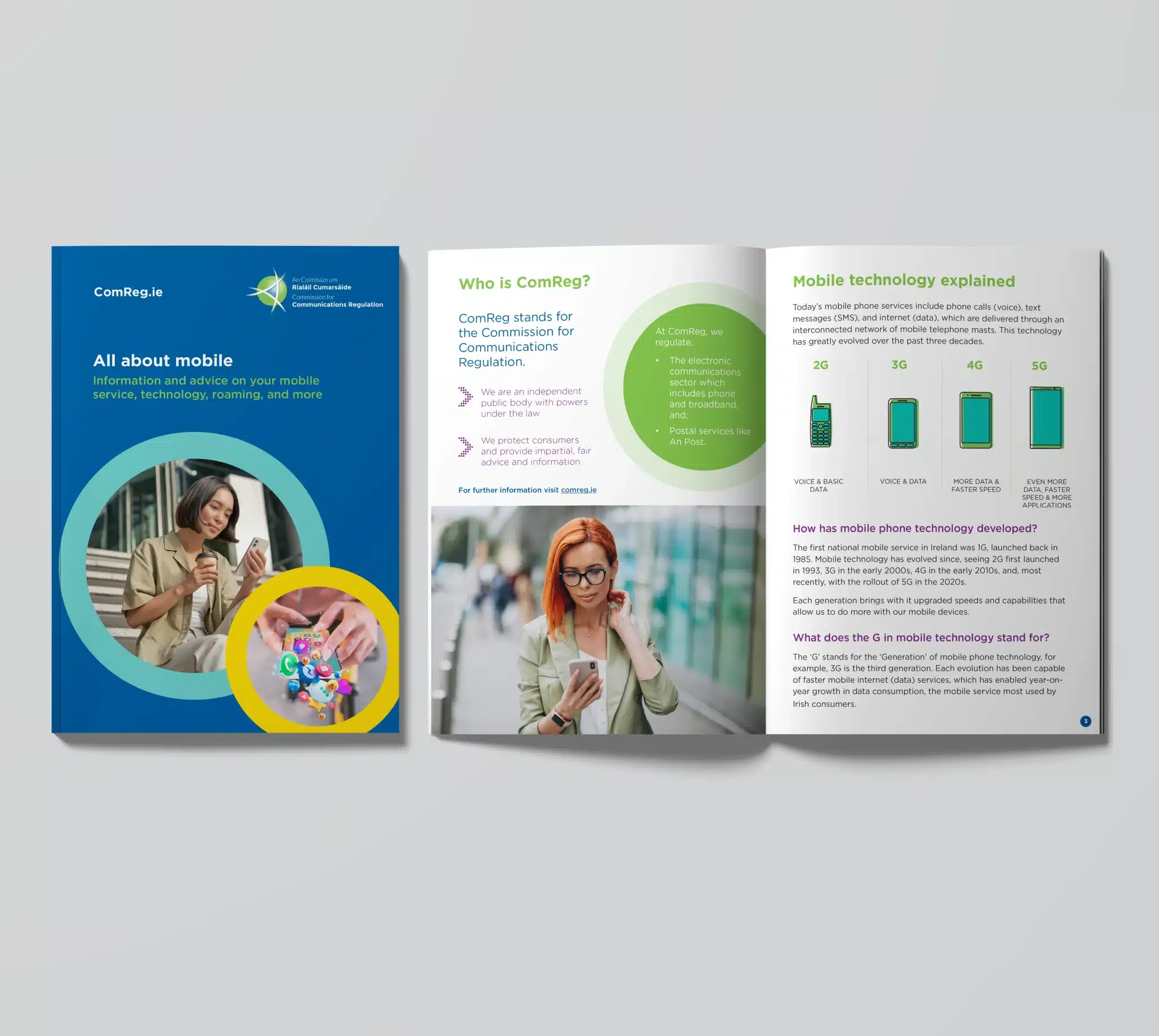 As a trusted brochure design agency in Dublin and Ireland, we worked closely with ComReg to design a visually engaging, informative, and easy-to-navigate A5 brochure that educates consumers about mobile technology, roaming, coverage, and 5G expansion in Ireland.