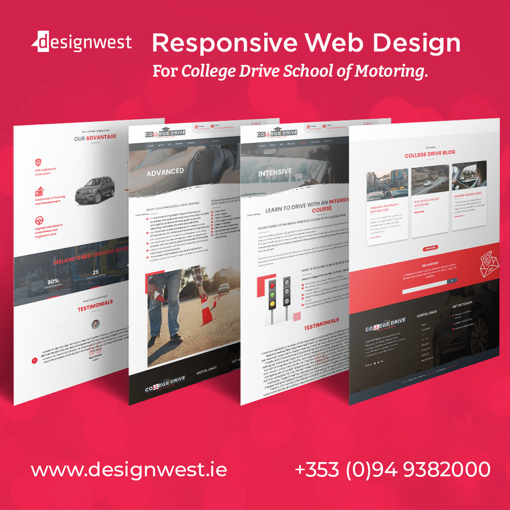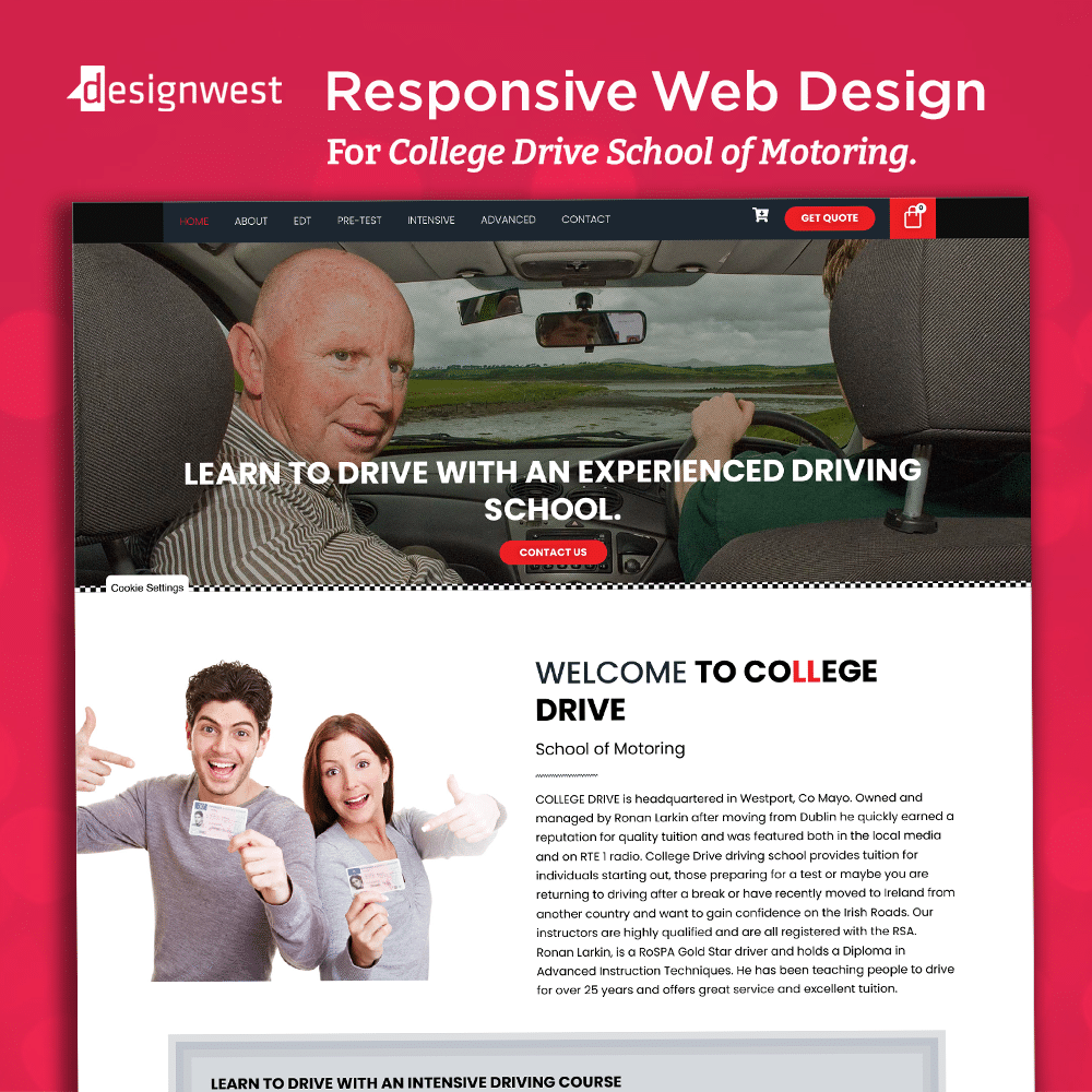 Our new website design for College Drive Intensive Driving Courses. College Drive is headquartered in Westport, Co Mayo and is owned and managed by Ronan Larkin. College Drive driving school provides tuition for individuals starting out and those preparing for a test. Check out their website here: https://collegedrive.ie